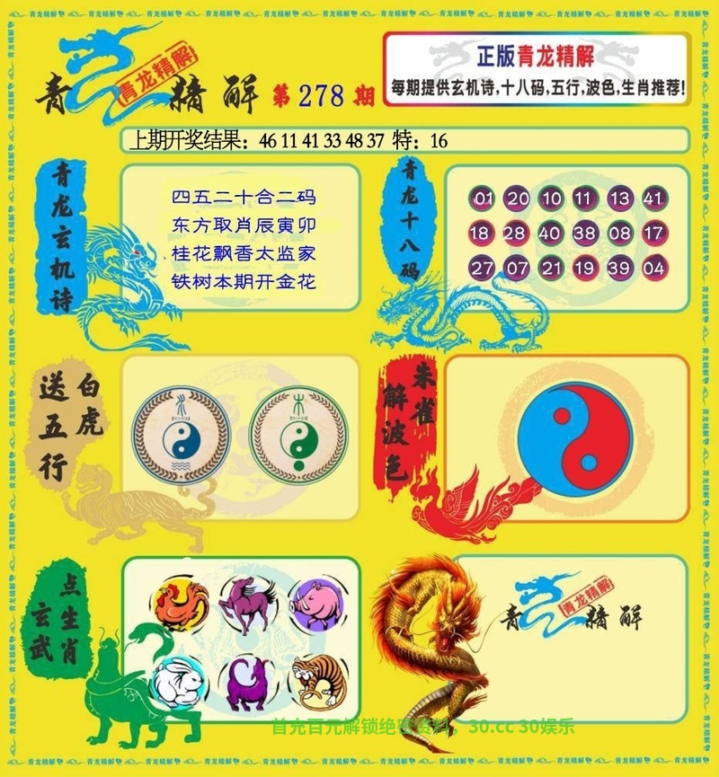 278期平特:【龙】 278期二连:【龙羊】【鸡蛇】 278期三连:【龙羊牛】【鸡蛇狗】 |